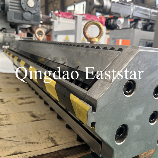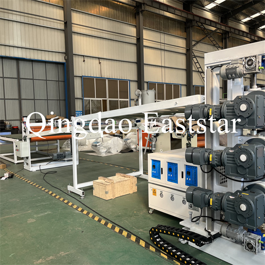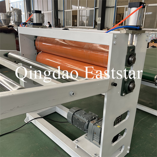 Thiết bị máy đùn tấm chống trượt PVC mềm: Thiết bị chủ yếu bao gồm máy đùn trục vít đơn, máy cán ba con lăn, máy làm mát dài 6 mét giá đỡ, máy kéo con lăn cao su, máy cắt và thiết bị băng tải.