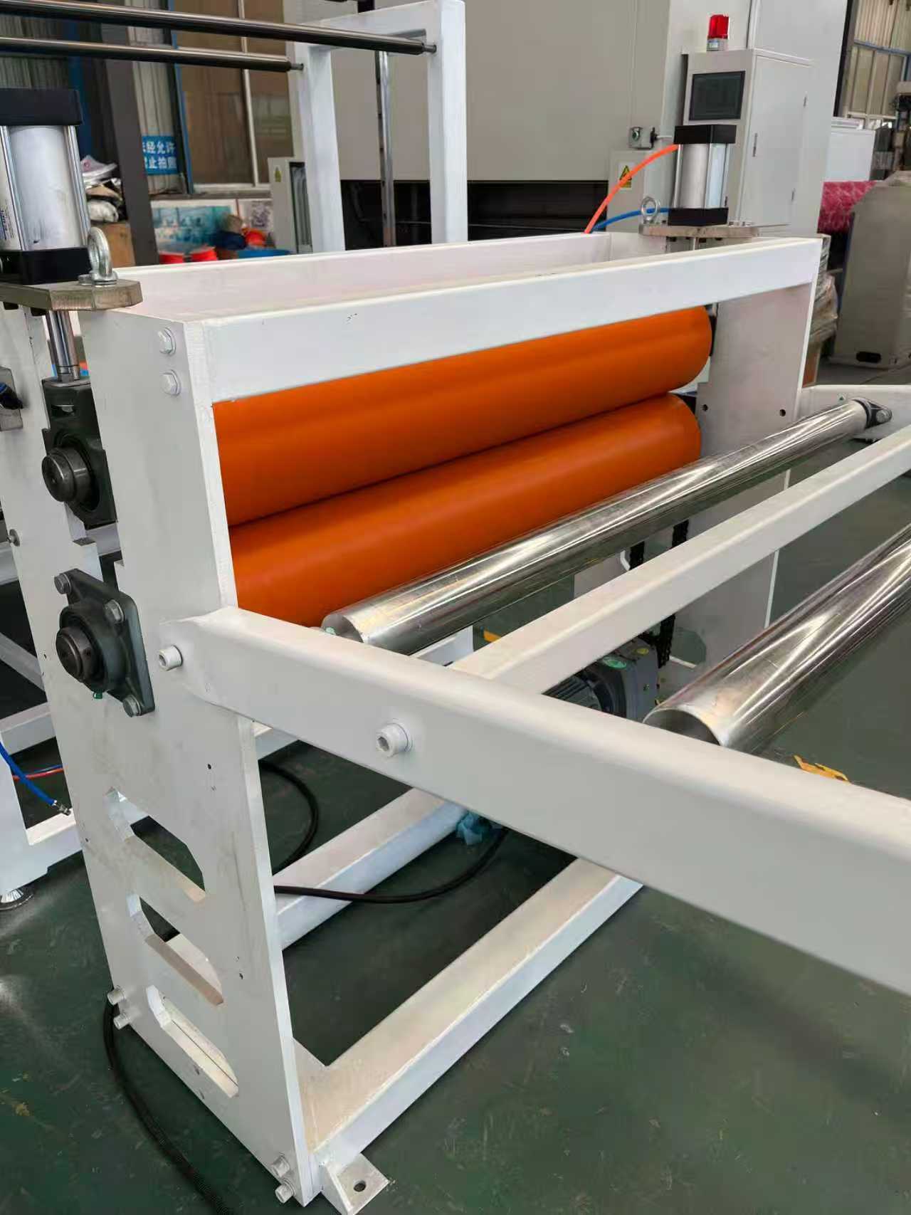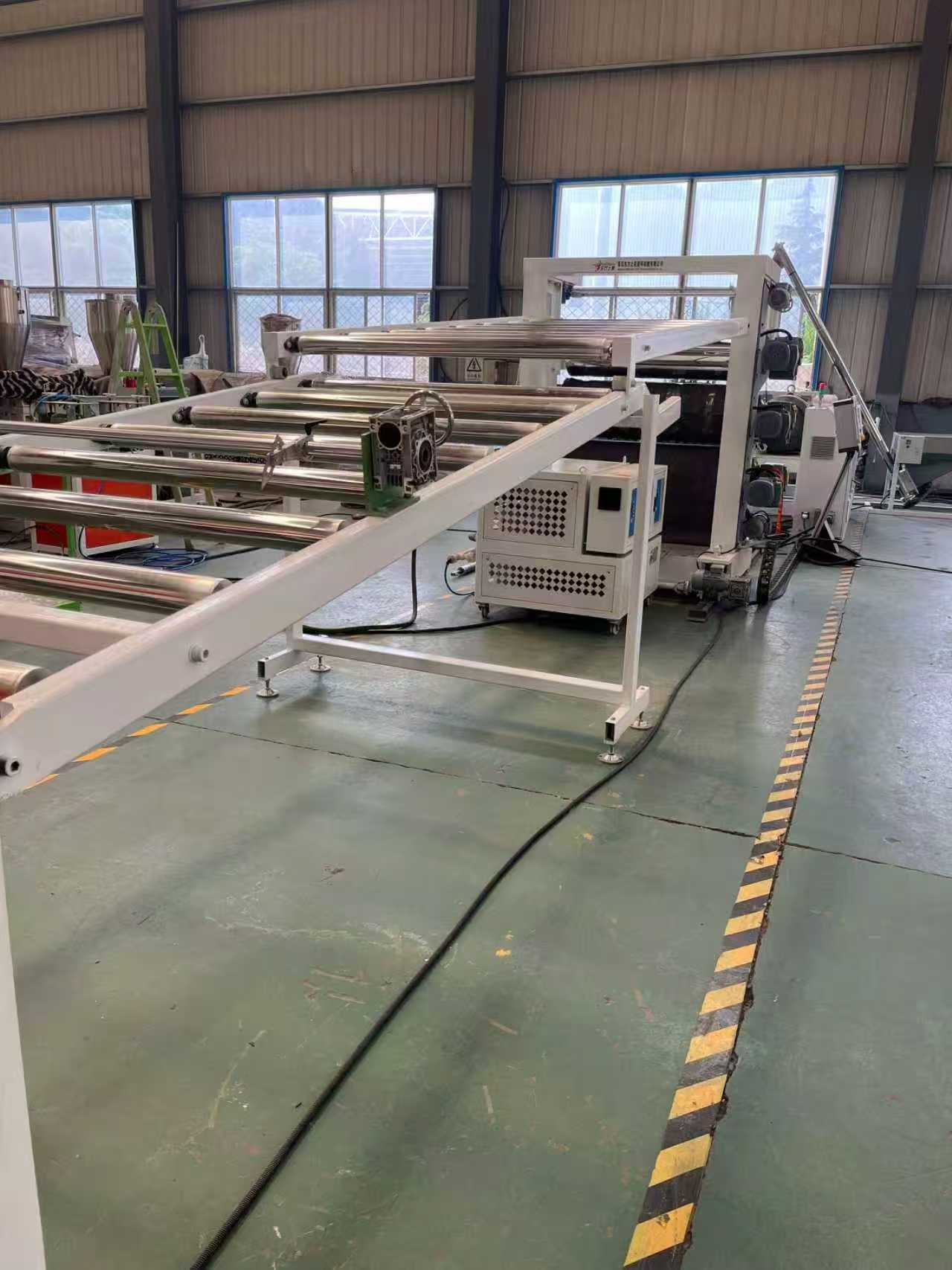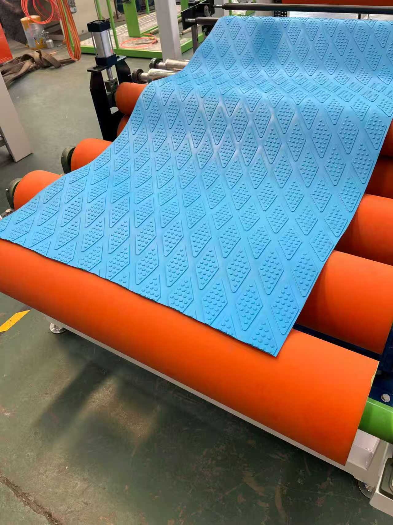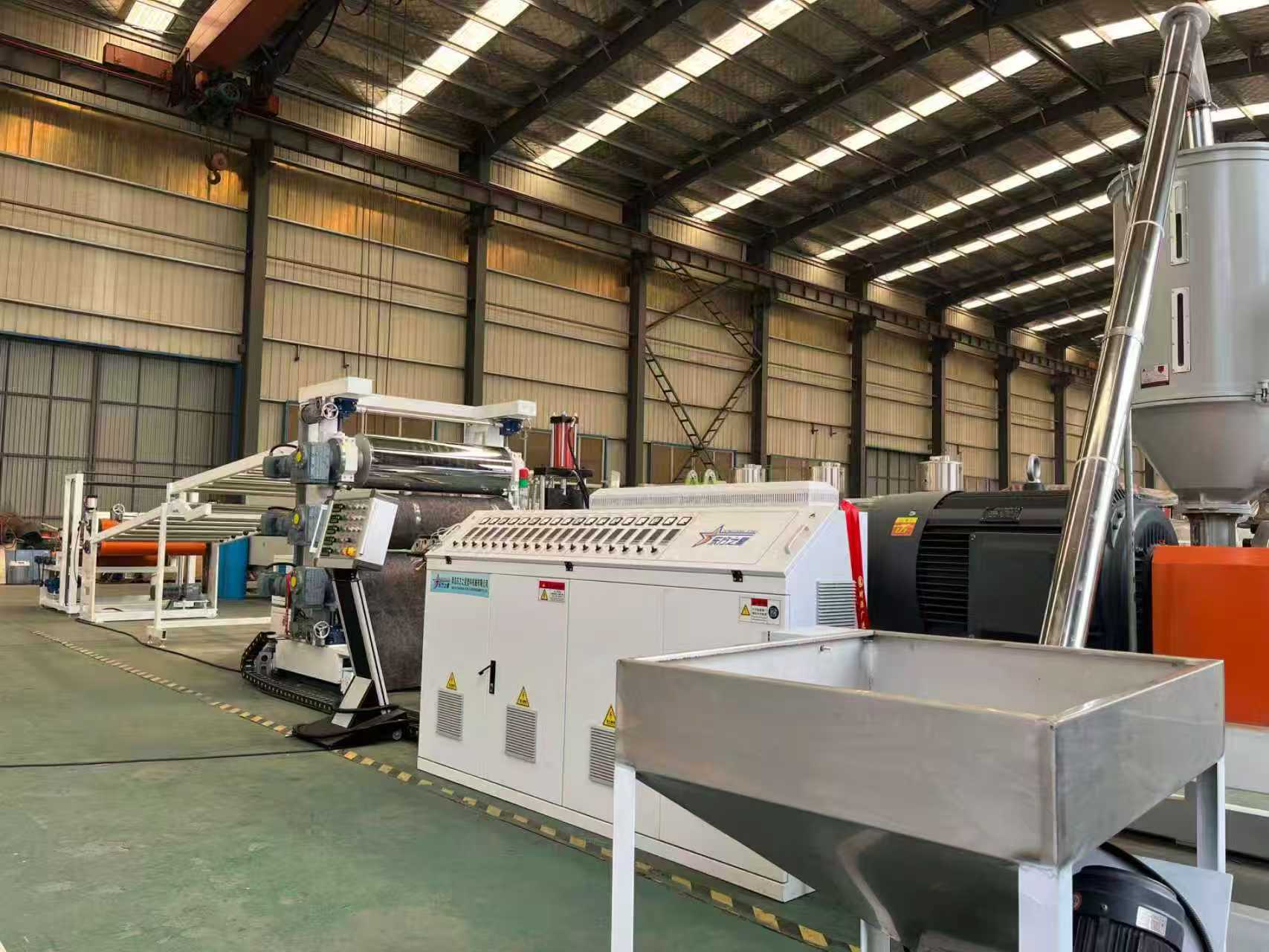 Thiết bị thảm lót sàn ô tô chống trượt TPE-1000mm: Thiết bị chủ yếu bao gồm máy đùn trục vít đơn, máy cán ba con lăn, giá đỡ làm mát 6 mét, máy kéo con lăn cao su, máy cắt và thiết bị băng tải.